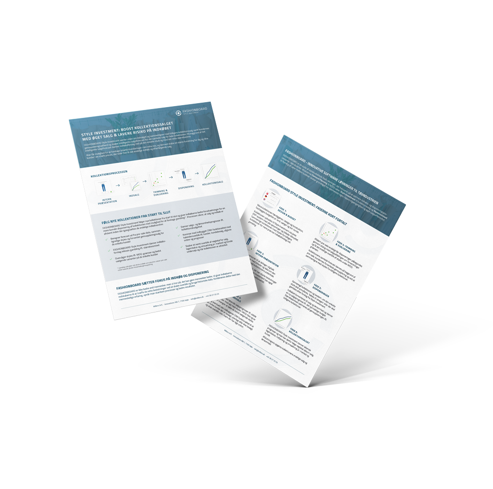 FASHIONBOARD Style Investment samler viden om indsalget og sammenligner med tidligere kollektionssalg samt kundernes gensuppleringsadfærd og skaber intelligente salgsforecast for det samlede salg for hele kollektionen. På baggrund af det intelligente salgsforecast dannes indkøbsforslag ned på den enkelte style og med det rette størrelsesmix.